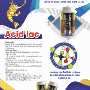 ACID LAC: sản phẩm bổ sung các axit hữu cơ cho tôm cơ dạng bột, dùng trong thức ăn chăn nuôi tôm cá. Ngăn chặn các vi khuẩn gây tiêu chảy như E.coli.