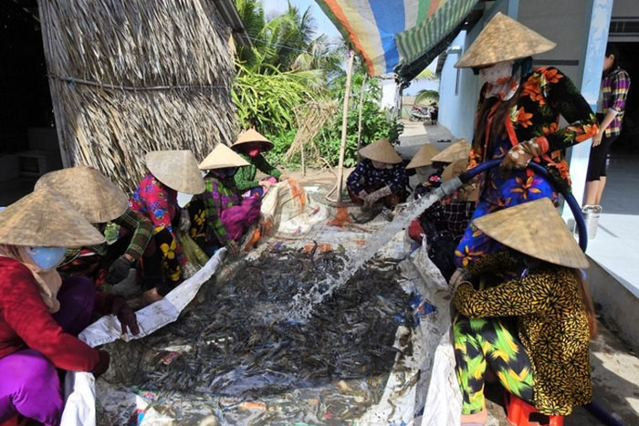 Mỗi năm, bà con nông dân ở Vĩnh Bình Bắc nuôi khoảng 3 vụ tôm càng xanh. Đến kỳ thu hoạch, thương lái sẽ đến kiểm tra, thỏa thuận giá và người thu hoạch tôm chính là hàng xóm của chủ ruộng.Vào những ngày thu hoạch, ruộng tôm đông như hội. Nhiều gia đình tạm gác việc nhà để sang giúp hàng xóm. Với họ, đây là cách vần công để vài hôm sau đến mình thu hoạch tôm thì hàng xóm qua tiếp lại.