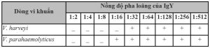 Hoạt tính ức chế vi khuẩn của bột lòng đỏ trứng đã được chứng minh như mô tả dưới đây. Như thể hiện trong Bảng, độ pha loãng tối đa của của IgY đối với V. harveyivà V. parahaemolyticus lần lượt là 1:16 và 1: 8.