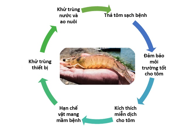 Điểm quan trọng để bắt đầu là cần áp dụng các giải pháp giúp đảm bảo an toàn sinh học trong trại nuôi và điều đó có thể được thực hiện bằng cách kiểm nghiệm, kiểm dịch tôm giống đảm bảo tôm sạch bệnh, xây dựng các rào cản vật lý (sử dụng lưới lọc khi cấp nước, xử lý nước thật kỹ trước khi cấp vào ao, đặt lưới côn trùng trên ao…), kiểm soát cho ăn tránh dư thừa, giảm tác nhân gây stress trong ao (che bóng ao để giảm biến động nhiệt độ và pH.. ), thực hành quản lý tốt trang trại (thả giống lớn, dùng men vi sinh, áp dụng biofloc)