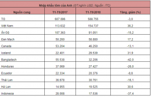 Chín tháng đầu năm nay, NK tôm của Anh đạt 588,8 triệu USD, giảm 3% so với cùng kỳ năm 2017. Việt Nam là nguồn cung tôm lớn nhất cho Anh, chiếm 26,3% tổng giá trị NK tôm của Anh. Ấn Độ đứng thứ hai chiếm 15,5%. Trong số các nguồn cung tôm chính cho thị trường này, NK tôm của Anh từ Việt Nam, Đan Mạch, Iceland tăng lần lượt 36%, 17%, 32% trong khi NK từ Ấn Độ, Canada, Bangladesh giảm lần lượt 15%, 13%, 42%.