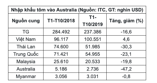 Theo số liệu của Trung tâm Thương mại Thế giới, 10 tháng đầu năm 2019, nhập khẩu tôm của Australia đạt 237,4 triệu USD, giảm 16,6% so với cùng kỳ năm 2018.