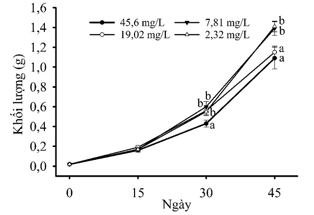 Hàm lượng CO2 càng cao dẫn đến tăng trưởng tôm càng chậm so với nước có hàm lượng CO2 thấp. Tăng trưởng của tôm thấp nhất ở nghiệm thức CO2 là 45,6 mg/L lần lượt là 1,09 g/con và 4,69 cm/con.