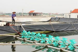 Khu nuôi tôm thẻ chân trắng của ông Hoàng Đức Thiện ở xóm Tây Bình có tổng diện tích khoảng 15ha, được quy hoạch thành 50 ao nuôi với diện tích từ 1.000-2.000 m2/ao. Để đảm bảo hiệu quả cho các vụ nuôi, ông đã đầu tư khoảng 500 triệu đồng/ao kè bờ bê tông kiên cố cao khoảng 2 mét, đáy ao trải bạt dày; trang bị hệ thống quạt nước, máy sục oxy giúp tôm sinh trưởng và phát triển khỏe mạnh. Với mật độ nuôi thả từ 150-250 con/m2, mỗi năm trang trại của ông thường nuôi 2 vụ tôm (vụ tôm xuân hè từ tháng 2 đến tháng 6; vụ đông từ tháng 8 đến tháng 12). Năm 2018 trang trại nuôi thủy sản của ông đã xuất bán được trên 100 tấn tôm, doanh thu đạt khoảng 20 tỷ đồng.