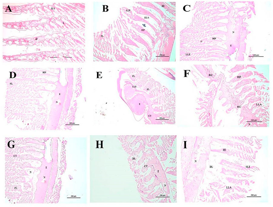 Mô mang tôm ở các nghiệm thức khác nhau: (A) Nghiệm thức đối chứng (B) pH6; (C) pH10; (D) TAN9; (E) pH6TAN1; (F) pH6TAN9; (G) pH8TAN9; (H) pH10TAN1; (I) pH10TAN3