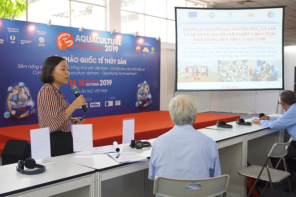 Buổi lễ khai mạc Aquaculture Vietnam. Ảnh: Tép BạcTriển lãm thu hút khách tham quan chuyên ngành trong và ngoài nước. Ảnh: Tép BạcTS. Cao Lệ Quyên – Viện Kinh tế và Quy hoạch thủy sản trình bày trong hội thảo với chủ đề Nguồn lợi nghêu tại Bến Tre, Tiền Giang và Trà Vinh. Ảnh: Tép BạcNông dân nuôi nghêu đang lắng nghe trình bày từ các chuyên gia. Ảnh: Tép Bạc