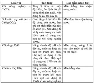 Tác dụng của vôi trong cải tạo ao nuôi tôm gồm: nâng pH, cải tạo đất phèn, cải thiện độ kiềm, cải thiện môi trường, độ cứng và hỗ trợ tiêu diệt mầm bệnh. Trong một số trường hợp, vôi (dolomite) còn được dùng kết hợp với quạt nước để tạo độ đục tạm thời cho nước ao nuôi khi tảo không phát triển. Mỗi loại vôi có tính chất riêng và được sử dụng cho các mục đích khác nhau. Vôi nông nghiệp (CaCO3) được dùng nhiều trong khâu cải tạo đáy ao vì giúp hỗ trợ hệ đệm, ổn định pH lâu dài trong quá trình nuôi. Để diệt khuẩn hoặc nâng cao độ pH, dùng vôi sống CaO hoặc vôi tôi Ca(OH)2. Vôi đen (dolomite) nên dùng để xử lý nước trong vụ nuôi. Để đảm bảo tác dụng, vôi phải được rải đều khắp mặt ao. Nên chọn mua vôi của nhà cung cấp uy tín, có độ mịn cao, độ ẩm thấp và không lẫn tạp chất.